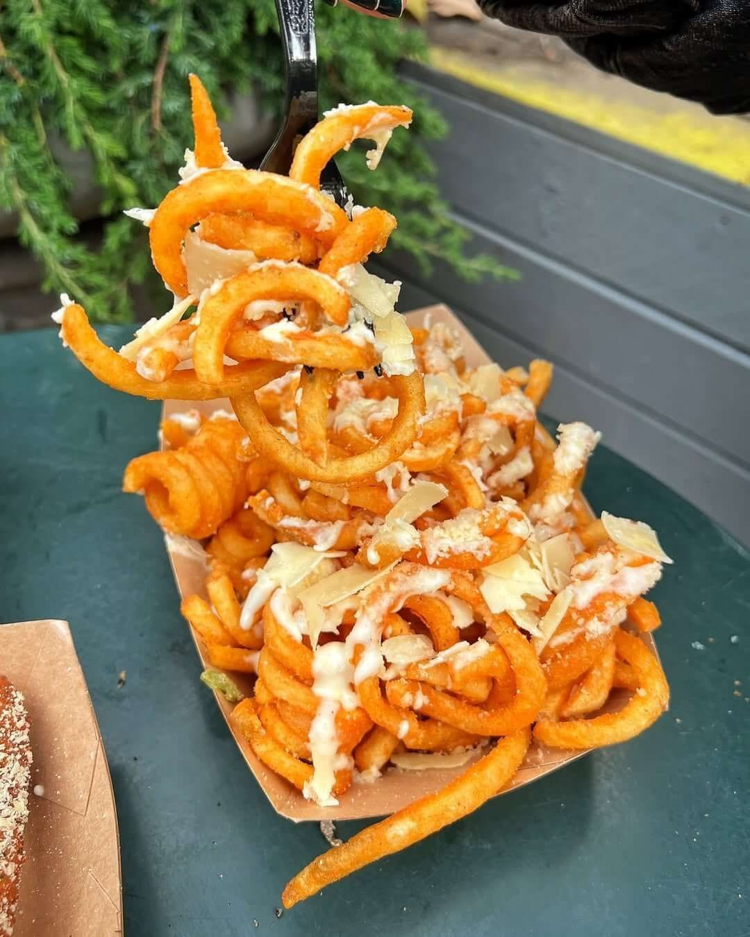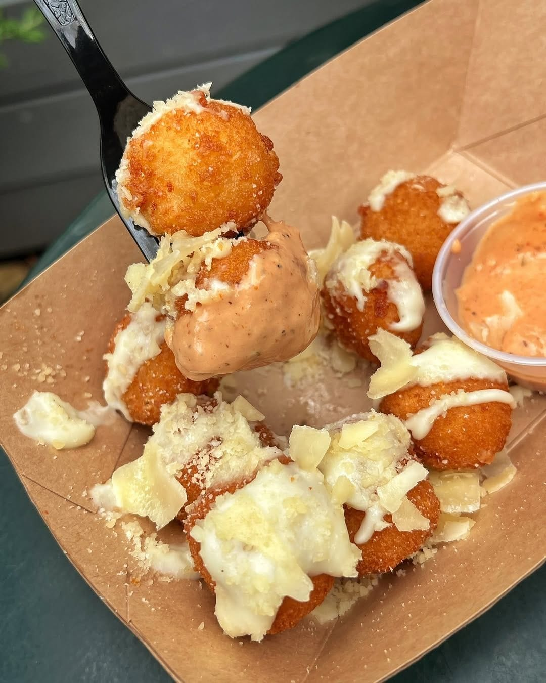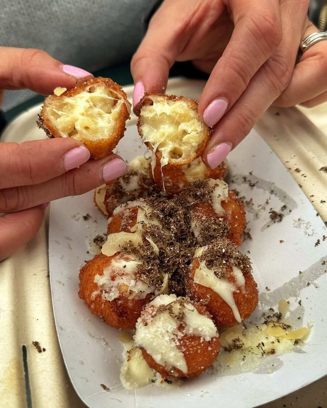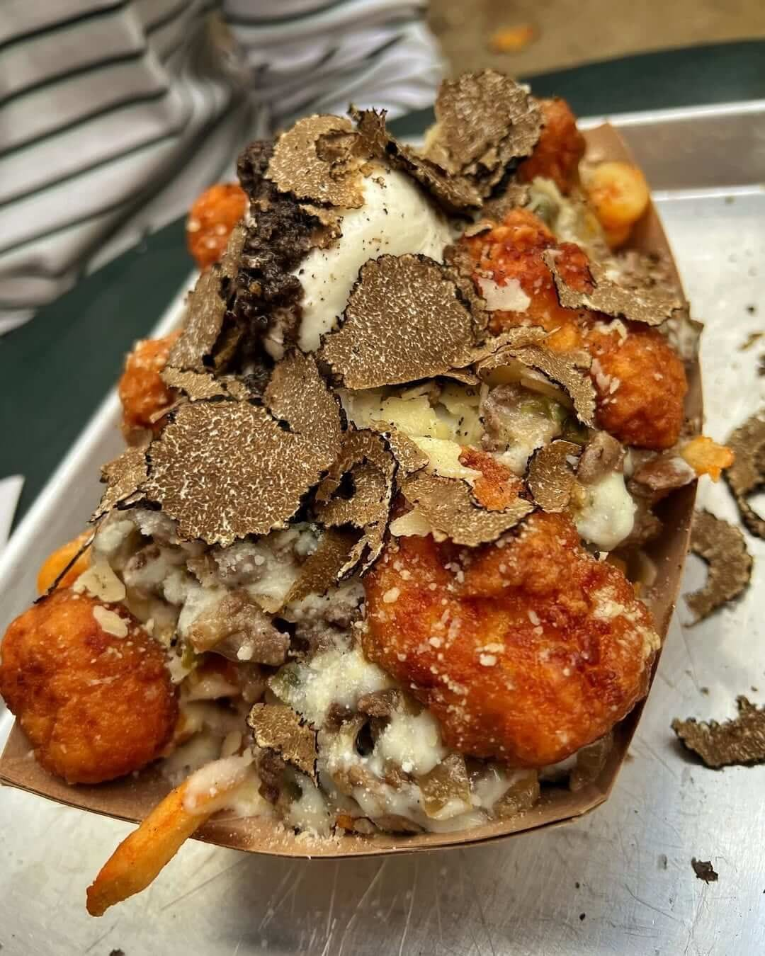 Burrata injected with truffle sauce, truffle buffalo chicken nuggets, cheese sauce, shaved and grated parm, freshly shaved truffles.